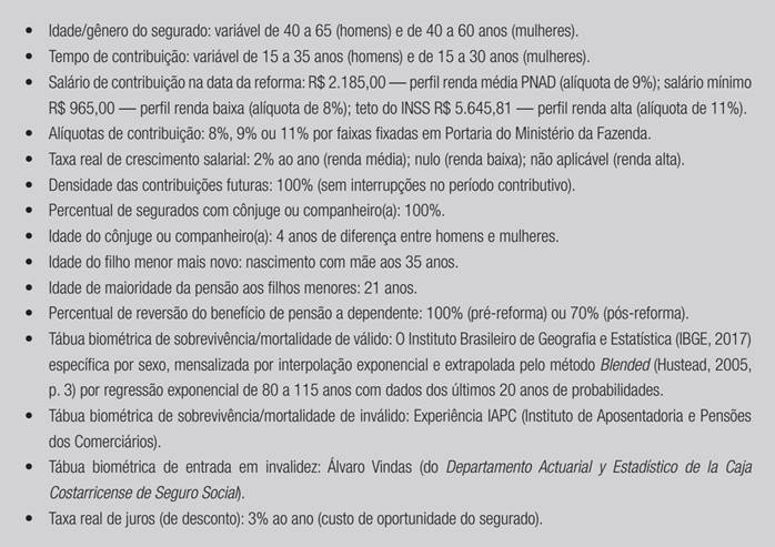 O fluxo de caixa e seu valor presente atuarial partiram do modelo de microssimulações não comportamentais para indivíduos representativos, com características diferenciadas de gênero, idade e tempo de contribuição, além do salário de contribuição (proxy para perfil de renda). Os cálculos foram feitos para milhares de perfis de segurados do INSS que ainda não cumpriram os requisitos para aposentadoria programada, sujeitos à regra de transição. O tempo de contribuição variou desde 15 anos (carência de 180 contribuições) e a idade foi variada desde 45 anos para homens ou desde 40 anos para mulheres, pois com essas idades se completarão 65 ou 62 anos, respectivamente, no futuro quando a idade mínima de transição se equipara à regra definitiva. Dessa forma se oferece ampla compreensão sobre o impacto das alterações nas regras de benefícios a conceder na situação da possibilidade de aprovação da PEC 287 (2016). O Quadro 2 expõe os perfis dos segurados e as premissas atuariais utilizadas para as projeções na data-base da alteração das regras com a aprovação da reforma.