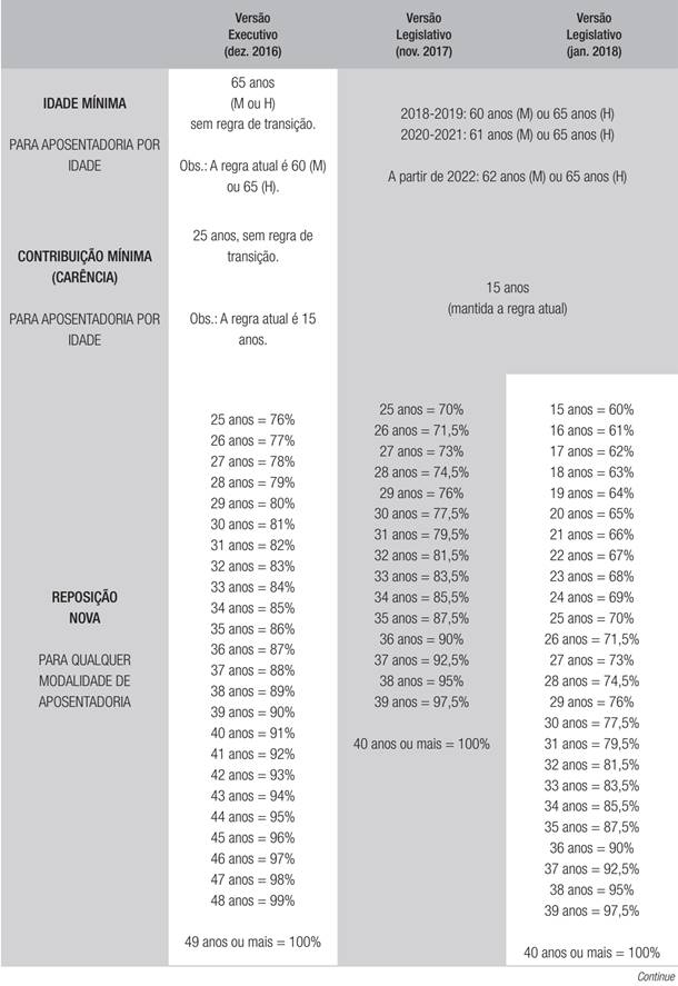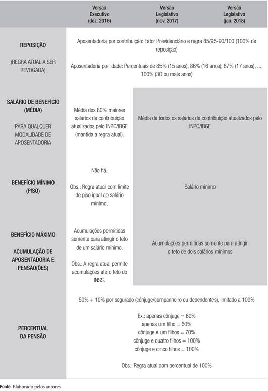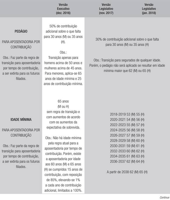 A PEC 287 (2016) sofreu algumas modificações desde sua versão original elaborada pelo Poder Executivo e encaminhada ao Poder Legislativo no final de 2016 até o último ano de mandato do Presidente Temer, em 2018. Para ter uma noção das dificuldades enfrentadas no âmbito político para sua aprovação, que no caso brasileiro exige votação em 2 turnos e aprovação de ao menos 3/5 dos membros das 2 casas do Legislativo (Câmara dos Deputados e Senado Federal), expomos as 3 principais versões da proposta de reforma, ainda não aprovada até o momento da elaboração deste estudo, e detalhamos a evolução de suas alterações paramétricas propostas para as aposentadorias urbanas do RGPS (ver apêndice).