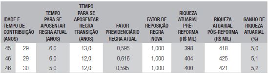 Os mais atingidos negativamente sofreram perdas de riqueza de até 37,3% (homens) ou até 41,2% (mulheres), revelando o grupo com idade alta próxima à aposentadoria por idade (65 anos para homens ou 60 anos para mulheres, pela regra pré-reforma), pouco tempo de contribuição (que se filiaram ao RGPS após os 30 anos de idade), insuficiente para se aposentar por tempo de contribuição, e renda alta, superior ao teto do INSS. A explicação decorre da grande diminuição na reposição equivalente a 25 pontos percentuais na aposentadoria por idade, e da mudança na forma do cálculo da média (dos 80% maiores para todos os salários de contribuição). Quanto ao gênero, as mulheres foram mais prejudicadas porque a idade mínima de elegibilidade para a aposentadoria por idade é elevada de 60 para 61 anos após 2 anos de vigência da reforma e para 62 anos após 4 anos, enquanto para os homens se mantém inalterada aos 65 anos.