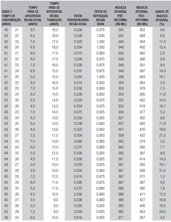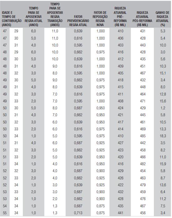 Entre os segurados com ganho de riqueza atuarial também se constatou que para uma mesma combinação de gênero, idade e tempo de contribuição, aqueles mais favorecidos, proporcionalmente, são os de renda média, seguidos pelos de renda baixa e, por sua vez, seguidos pelos de renda alta. Por exemplo, um perfil de segurado do sexo masculino de 50 anos de idade e 34 anos de contribuição e renda média (R$ 2.185,00) obterá um ganho de riqueza de 20,6%. Já para salário de contribuição sobre o piso do INSS (renda baixa) e sobre o teto do INSS (renda alta), os ganhos são de 12,4% e 11,4%, respectivamente. Fenômeno qualitativamente semelhante ocorre para seguradas do sexo feminino de, por exemplo, 45 anos de idade e 29 anos de contribuição, cujos ganhos são de 24% (renda média), 11,8% (renda baixa) e 9,9% (renda alta). Isso ocorre porque os que recebem salário mínimo contribuem com a alíquota mínima de 8%. Os segurados que recebem acima do teto obterão ganhos ligeiramente menores por ter que contribuir no período adicional de pedágio com uma alíquota maior que 11%. Em relação ao grupo estudado com renda média, este obteve os maiores ganhos, pois apesar de contribuírem com alíquota mediana de 9%, trabalhamos com a premissa de que ele tenha crescimento salarial de 2% ao ano, o que faz aumentar substancialmente o valor inicial de reposição do benefício de aposentadoria mesmo com a alteração na forma do cálculo da média antes fixada sobre 80% das maiores contribuições (expurgando-se as 20% menores) e, após a reforma, sobre todas as contribuições.