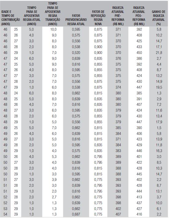 A variação (ganho ou perda) de riqueza atuarial foi calculada para cada segurado representativo (combinação idade, tempo de contribuição, gênero e renda). Como as regras de transição das reformas previdenciárias geralmente não são definidas a partir dos princípios de neutralidade atuarial, podem ocorrer grandes diferenças entre as variações de riqueza pré e pós-reforma. Pela aplicação compulsória do pedágio, o segurado sob a regra de transição estará sujeito a maior período de trabalho e, consequentemente, de contribuição, até a aposentadoria programada. Por outro lado, a mudança das regras do fator de reposição pode favorecer alguns grupos com o aumento do valor inicial da aposentadoria. Isso ocorre devido à revogação do fator previdenciário e da regra “85-95” aplicados à média dos 80% dos maiores salários de contribuição, ambos substituídos pelos novos percentuais de reposição que variam de 60% a 100%, contendo acréscimos anuais de 1%, 1,5%, 2% ou 2,5%, aplicados à média de todos os salários, conforme as regras resumidas na Tabela 1.