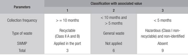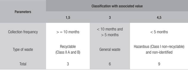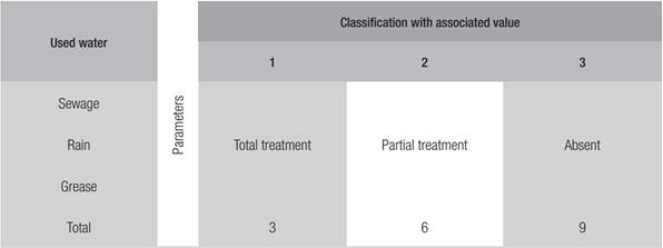 Used water (UW) - Following NBR 9896 (ABNT, 1993) is sewage, rain water and water with oil residues. Box 3 brings the parameters used to rate used water management, knowing that the better the management associated with the parameter, the lower the value is.