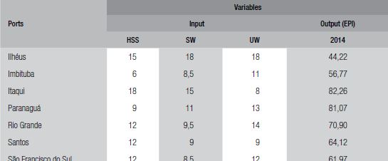 Table 1 shows the values attributed to each of the seven ports, after applying the suggested methodology, and EPI for 2014.