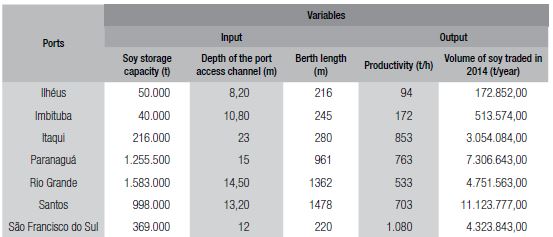 The seven ports (Port of Ilhéus, Itaqui, Santos, Imbituba, Paranaguá, Rio Grande, and São Francisco do Sul) are included in the PCBS, and traded 64,3% of the entire amount of soy traded in ports in Brazil in 2014.