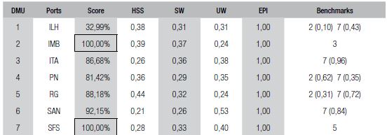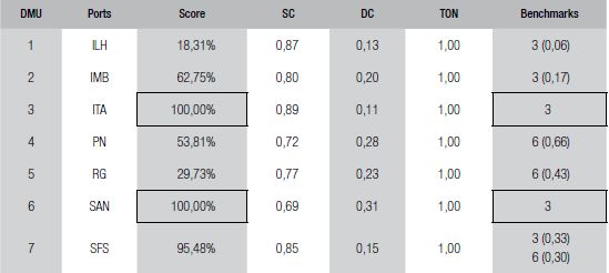 The following table brings the results obtained by the Efficiency Measurement System (EMS) software, showing that the DMUs (Decision Making Units) with relative efficiency were DMU 2 and 7, both scoring 100% (DEA = 1). They are efficient, given the conditions of all of the ports analyzed, in relation to the others.