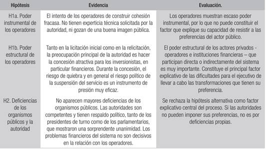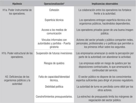 En función de esta pregunta, la principal hipótesis de investigación es que el poder empresarial que ejercen los operadores juega un rol fundamental en que la autoridad política no pueda imponer sus preferencias en el proceso regulatorio. Por este término se entiende la relación que se establece entre actores públicos y privados a través de la licitación de un servicio, incluyendo así tanto el diseño de procesos competitivos para la adjudicación de contratos, como la implementación de aquellos. Para desarrollar esta hipótesis, a continuación presentamos el marco teórico del estudio. Luego se plantea el estudio de caso, considerando hipótesis alternativas. Todas estas están evaluadas a través del process tracing del caso. Finalmente, en la conclusión se señalan las implicancias más generales de los resultados de este estudio.