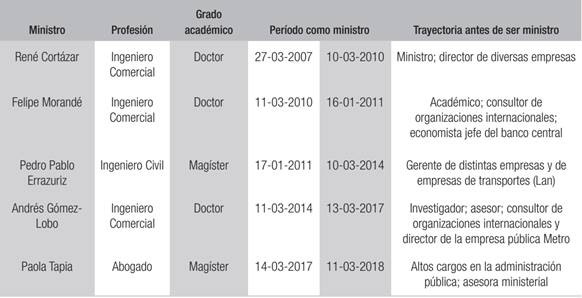 Los primeros días del Transantiago fueron caóticos, provocando un fuerte impacto económico y político en el país (Mardones, 2008). Por lo mismo, la solicitud de renuncia al entonces ministro Sergio Espejo no sorprendió mayormente, pues el Transantiago venía acarreando diversas dificultades en su funcionamiento. Sin embargo, todos los ministros de transportes a partir de esta etapa han ostentado importantes credenciales académicas, a la vez que dan cuenta de una gran experiencia en el sector público, privado y en el mundo académico. Claramente no se trata de autoridades débiles. El siguiente cuadroresume las características de estos relevantes actores políticos.