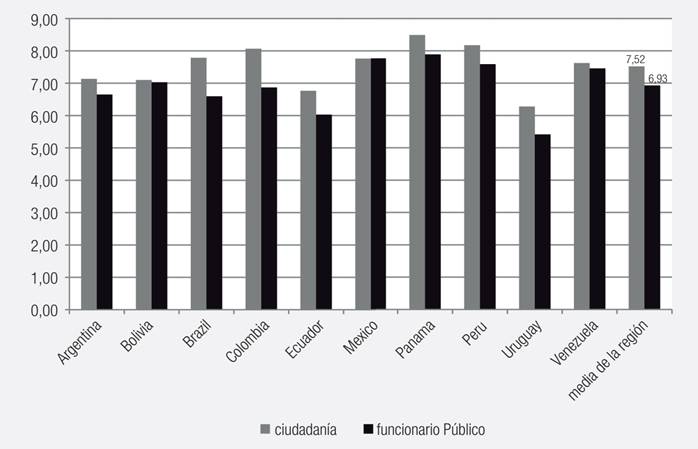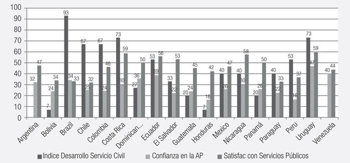 Salvo en Uruguay, donde los funcionarios en un 61 % confían en la AP, en el resto de países de la región tanto funcionarios como ciudadanos la confianza es menos a 40%. Los casos más preocupantes son Honduras y Perú con valores inferiores al 20%.