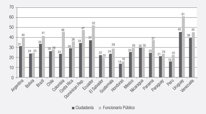 Por su parte, como pone en evidencia el Gráfico 2, la brecha distinguiendo entre funcionarios y ciudadanos es de 10 puntos porcentuales de media, con excepciones como Colombia, Uruguay y Ecuador donde la brecha es de 22, 16 y 15 puntos respectivamente y en el extremo opuesto Bolivia y Nicaragua donde la brecha no llega a 1 punto.