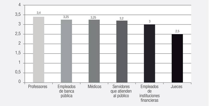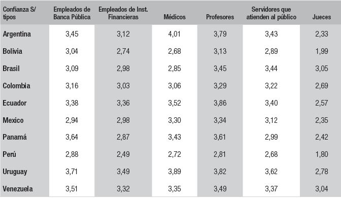 Si se trata a los funcionarios diferenciadamente (Gráfico 3), los servidores públicos que mayor confianza despiertan en la ciudadanía son quienes proveen servicios públicos sociales tangibles como salud y educación en contraposición a los jueces, quienes salvo en el caso de Brasil son siempre los funcionarios con menor tasa de confianza. Los médicos sobresalen en Argentina y Uruguay, mientras que los maestros en Bolivia, Brasil y Ecuador. Llama la atención en Panamá, Perú y Venezuela que son los empleados de Bancos quienes despiertan mayores niveles de confianza. Sin embargo, no existen grandes distancias cuando se comparan las medias.