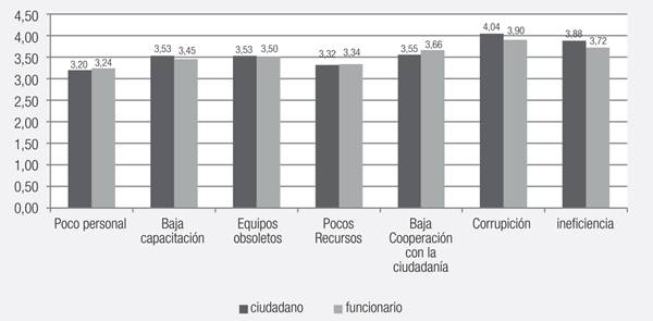 Como se observa en el gráfico 5 la corrupción es para funcionarios públicos como para ciudadanos el principal problema del sector (encuesta CAF), seguido muy de cerca por la ineficiencia y la baja cooperación que existe con la ciudadanía. No se observan distancias importantes entre ciudadanía y funcionarios.