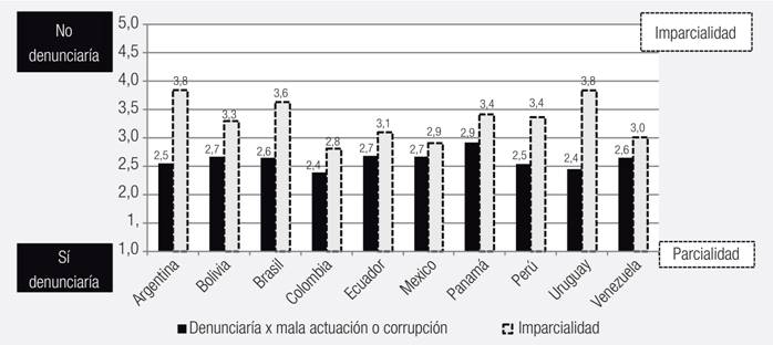 Pese al enojo con los niveles de corrupción, cuando se interroga a los sujetos si denunciarían a un compañero por mala actuación o corrupción, el 50% de los encuestados afirma denunciarían; mientras que el 25 %, no denunciarían. En una escala donde 1 es sí denunciaría y 5 no denunciaría, en Colombia y Uruguay hay mayoría clara de quienes sí denunciarían (2,4), mientras que en Panamá es menos clara la respuesta (2,9) cómo ilustra el eje de la izquierda del gráfico 7.