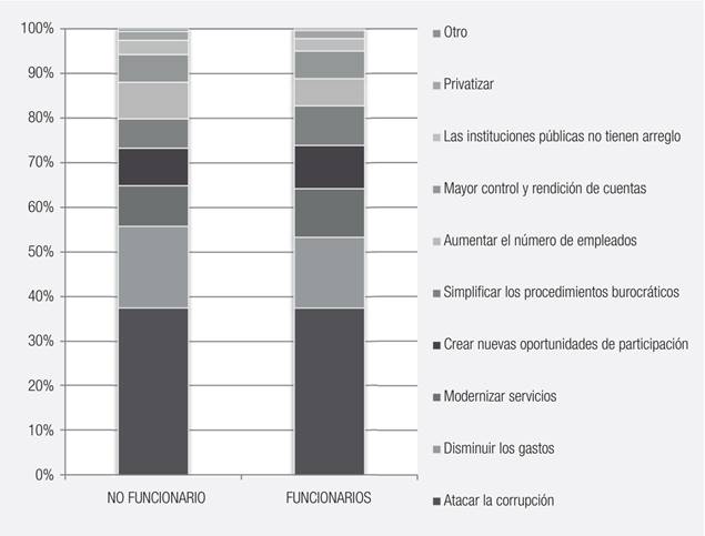 En Latinobarómetro se realizó una pregunta sobre el aspecto que se consideraba más importante para mejorar las instituciones en 2002. Las respuestas que más frecuencia reúnen son la de atacar la corrupción que se lleva casi el 40 % (tanto entre funcionarios como entre quienes no lo son), seguida por el consejo de disminuir gastos e introducir dinámicas de participación. Solo en torno al 3% de los encuestados cree que las instituciones no tienen arreglo y cerca del 2% propone la privatización. No se verifican diferencias apreciables entre las opiniones de funcionarios y no funcionarios.