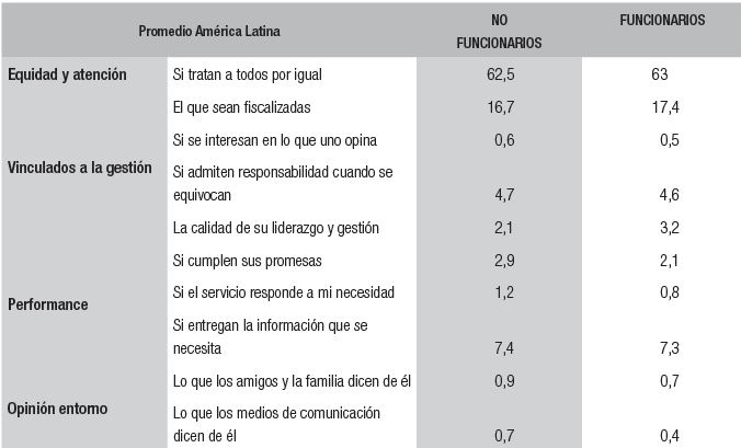 En la Tabla 3 se observa que, para la media de ciudadanos latinoamericanos (18 países), un determinante central de la confianza es el que las instituciones traten a todos por igual. El 63% de los funcionarios entrevistados la considera la primera razón, seguida por la fiscalización que se lleva un 17% de las respuestas de los funcionarios. Las respuestas de los ciudadanos van en la misma dirección, las diferencias son decimales.