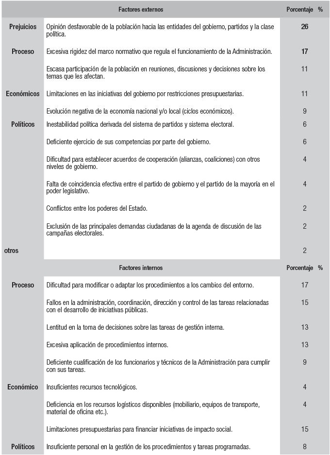 Cuando les pedimos identifiquen factores externos a la organización que podrían estar bloqueando el desarrollo de la confianza destacan, en primer lugar, los prejuicios hacia la propia administración (26%), en segundo lugar la excesiva rigidez con que opera la AP (17%), luego la poca participación en proceso de provisión de servicios (11%). En menor medida se cree que factores económicos o cuestiones de índole política sean responsables de la desconfianza. En relación a los factores internos, la respuesta que acumula más puntos es: dificultad para modificar o adaptar los procedimientos a los cambios del entorno (17%) seguida por fallos en la administración, coordinación, dirección y control de las tareas relacionadas con el desarrollo de iniciativas públicas (15%). Las cuestiones identificadas como propias del proceso se llevan el 67% de las respuestas, mientras que las de índole económica solo el 23% y las políticas el 8% (ver tabla 3).
