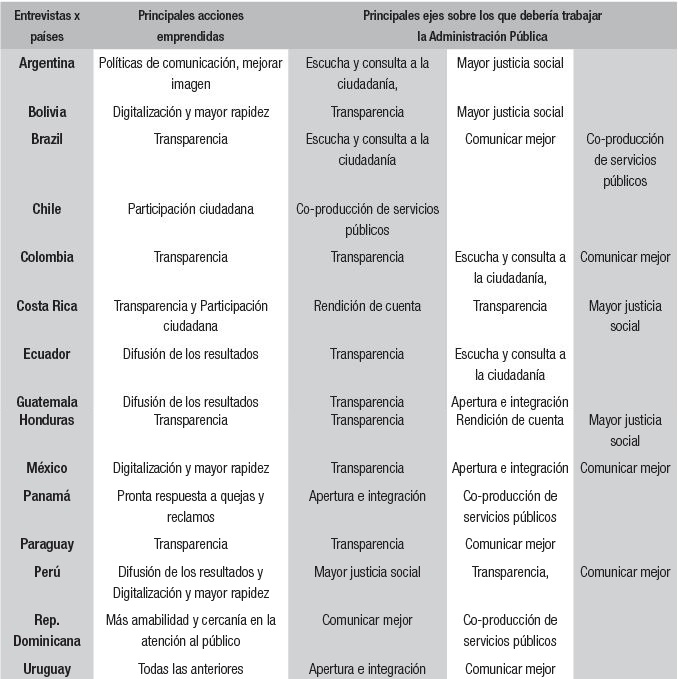 En lo que atañe a las acciones desarrolladas para mejorar la confianza, la respuesta más frecuente es la de políticas de transparencia (5 países la mencionan) referenciando con ello a la necesidad de publicación de información y mayor acceso a datos públicos. La segunda respuesta con más menciones son: digitalización y agilización de trámites (3 menciones) y políticas de difusión del quehacer de la Administración Pública (3 menciones). Solo 2 países mencionan la participación ciudadana. El resto se divide entre quienes priorizan la comunicación como estrategia de mejora de imagen, quienes se enfocaron en mejorar los tiempos de respuesta a quejas y sugerencias o quienes apostaron por mejorar la cercanía y la amabilidad de sus funcionarios en la atención al público. Hay un país, Uruguay, que dice haberse enfocados en todas las estrategias antes mencionadas. Ninguno de los encuestados refirió como estrategia el uso de redes sociales, la creación de portales web o la integración de actores como ONG o Asociaciones en labores públicas.