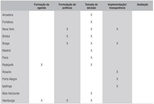 Em primeiro lugar, ao analisar o momento de inserção das ferramentas no ciclo do processo decisório das políticas públicas nas experiências estudadas, foi possível identificar que apenas as experiências de Amadora, Nova York, Madrid e Paris permitiram que o cidadão participasse desse primeiro momento do ciclo das políticas públicas, mas escolhendo dentre os temas pré-agendados pelo governo. Na fase de formulação das políticas públicas, os governos também se mostraram refratários à participação nesse momento específico do ciclo das políticas públicas, relegando essa fase ao aspecto técnico.