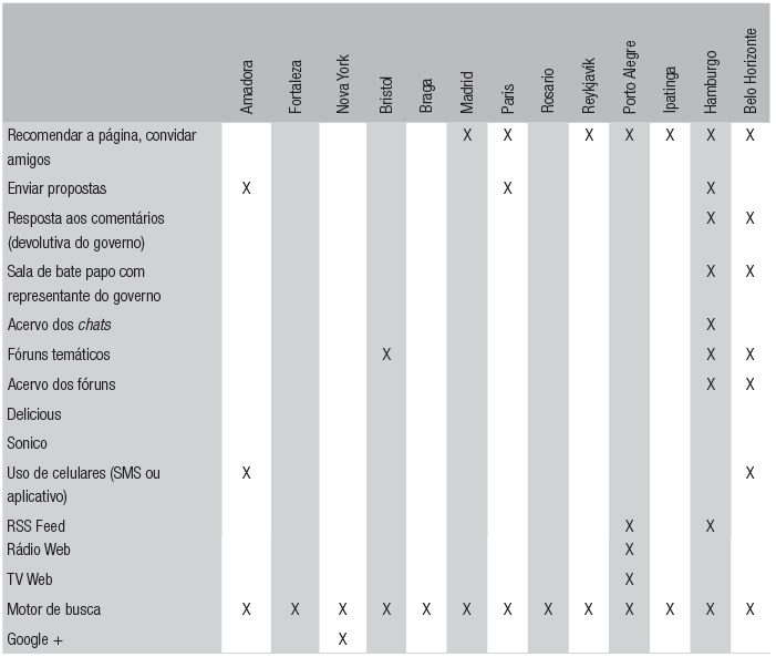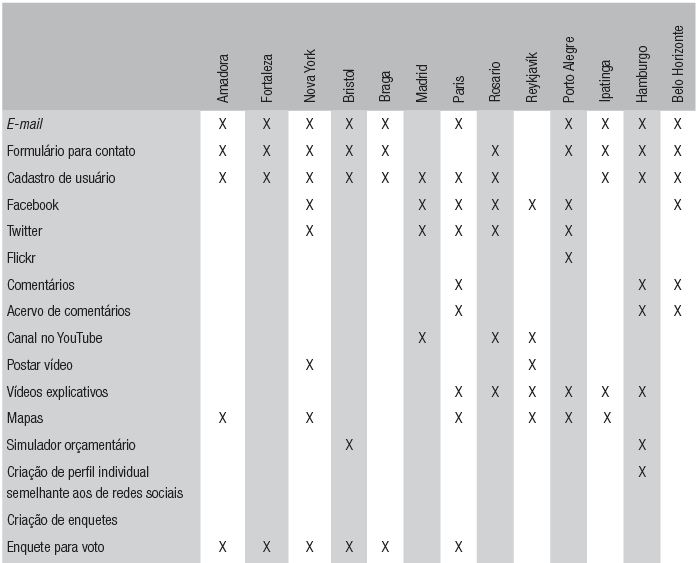 Não obstante, cinco das experiências de OPD analisadas adotaram o modelo de interatividade de discurso público: Paris, Bristol, Reykjavík, Hamburgo e Belo Horizonte. Nessas experiências, o formato de comunicação adotado foi o de três vias, com a disponibilização de fóruns e salas de bate-papo, onde os participantes tinham possibilidade de criar conteúdo e interagir entre si. Esse tipo de ferramenta interativa da Web 2.0 fornece mecanismos para a deliberação pública (Ferber et al., 2007).