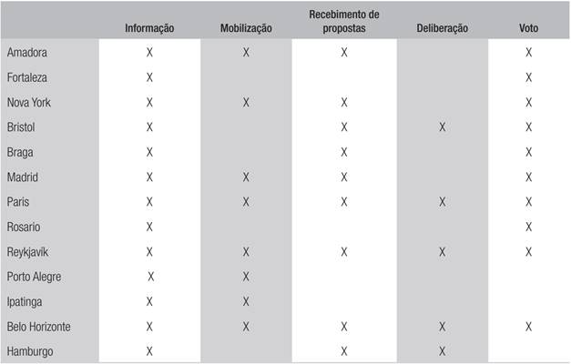 Após a análise das ferramentas de interação disponíveis foram identificadas as funcionalidades presentes nas plataformas de OPD: a) informação; b) engajamento e mobilização; c) apresentação de propostas; d) emissão da opinião e deliberação; e e) voto, conforme sugerido por Sampaio (2016).