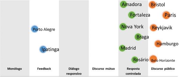 Além disso, a análise indicou que o modelo de interatividade mais utilizado nas plataformas de OPD foi o de “resposta controlada”. As experiências de OPD de Amadora, Fortaleza, Nova York, Braga, Madrid e Rosario são enquadradas nesse modelo, pois se permite a participação dos cidadãos, mas o gestor da plataforma mantém um controle significativo sobre o processo.