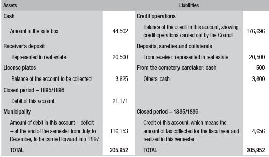 Despite the limited information, the accounting records, offered a clearer view of the City Council’s net assets position, as shown in the 1896 Balance Sheet (Table 1): there was a deficit between assets and liabilities balances recorded in an account on the assets side. Responsibility controls with countervailing entries either in assets and liabilities were used, and other receivables balances were posted under the heading ‘closed period’.