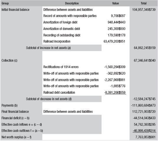 The rendering of accounts of 1905 for the state of São Paulo is the first concrete evidence of the Italian influence on public accounting in Brazil, that is, the record and the concomitant disclosure of budgetary and financial events with assets and liabilities and their changes in an official financial report, i.e., dual accounting. Note that the financial deficit (of 44,514,043$433) in the statement (recalculated in Table 2) is shown in the statement of revenue and expenditure (Appendix - Figure 7). The surplus (of 7,763,653$981) in the changes in the financial position was achieved by excluding the effective cash inflows and outflows (Table 2).
