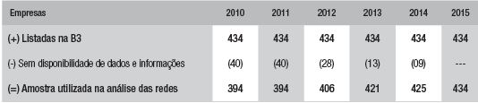 O estudo é caracterizado quanto aos objetivos como descritivo, quanto aos procedimentos como documental e a abordagem do problema de cunho quantitativo. O período de análise compreendeu 6 anos, dos exercícios de 2010 a 2015. A composição da população de pesquisa foi definida considerando as empresas de capital aberto listadas na B3 em dezembro de 2015. Essa composição foi necessária para que houvesse a disponibilidade do relatório de administração e do formulário de referência de todas as empresas da população pesquisada. Partiu-se das empresas listadas em dezembro de 2015 para, posteriormente, segregar aquelas listadas em cada ano de análise, considerando os dados para estabelecimento da análise de redes entre os conselheiros de administração.