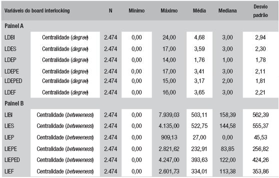 Verifica-se no Painel A da Tabela 3 que, em média, 74,82% das empresas apresentavam alguma ligação direta entre os conselheiros de administração, e 40,22% das empresas apresentavam alguma ligação indireta entre os conselheiros de administração. Destaca-se que os anos com maior percentual de ligação direta ocorreram em 2010, com 77,92% das empresas, e 2014, com 75,53% das empresas. Já as ligações indiretas ocorreram em maior proporção nos anos de 2010 e 2012, com 42,13% e 42,12%, respectivamente.