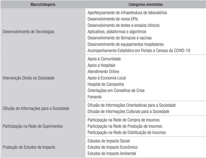 As categorias iniciais foram agrupadas em uma nova categorização mais abrangente, com cinco macrocategorias, apresentado no Quadro 1. A macrocategoria Desenvolvimento de Tecnologias envolve a criação de tecnologias físicas (vacinas, fármacos, equipamentos hospitalares, EPIs, etc.) e virtuais (portais estatísticos, aplicativos, algoritmos, etc) como forma de gerar capacidade de análise e resposta direta à COVID-19. A macrocategoria Intervenção Direta na Sociedade envolve as práticas extensivas da universidade, por meio das quais ela se integra diretamente com atores sociais e amplia o apoio em função dos efeitos da COVID-19. A macrocategoria Difusão de Informações para Sociedade consiste na difusão de conhecimentos científicos sobre a COVID-19 elaborados em diversas áreas, em linguagem acessível à população. A macrocategoria Participação na Rede de Suprimentos envolve um tipo de prática emergente nas universidades, relacionada à participação na produção em cadeia de suprimentos para a COVID-19. Por fim, a macrocategoria Produção de Estudos de Impacto abrange o conjunto de pesquisas, básicas e aplicadas, sobre Impacto Social, Econômico e Ambiental da COVID-19.