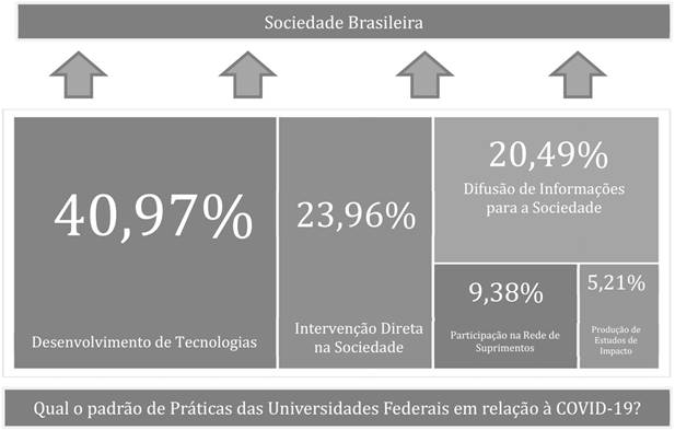 A análise das práticas de combate à COVID-19 desenvolvidas pelas universidades federais mostrou que essas instituições possuem infraestrutura física e humana para implementar, rapidamente, ações que integram a pesquisa e a extensão na resolução de problemas complexos e com impacto em diferentes áreas, como Saúde, Economia, Ambiente e Sociedade. A constatação de 65% de práticas orientadas a Desenvolvimento de Tecnologias e Intervenção Direta na Sociedade contrapõe-se à narrativa segundo a qual a universidade federal seria uma instituição fechada em si mesma, e pouco orientada à realidade local. Os percentuais obtidos, conforme a Figura 1, podem variar futuramente com uma nova coleta de dados, mas, considerando-se a distribuição proporcional identificada nas macrocategorias, é possível afirmar que o Sistema Federal de Educação Superior Brasileiro tem atuado de forma efetiva no combate à COVID-19, em razão do seu desenvolvimento tecnológico e da sua capacidade de intervir diretamente na sociedade.