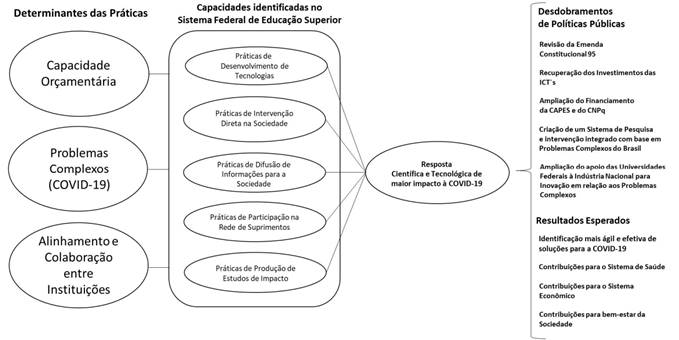 Existem três fatores externos relevantes, ou determinantes: o primeiro determinante foi a necessidade gerada pela COVID-19 - um problema complexo que requer novos conhecimentos -, uma vez que as respostas à nova doença ainda não estão disponíveis. O segundo determinante observado foram o alinhamento e a colaboração entre as instituições; conforme nota da Andifes, este foi um problema reconhecido nacionalmente e que contou com a coalizão de diversos agentes. Pode-se mencionar, ainda, que o volume de recursos executados é crítico ante a extensão das práticas identificadas. O terceiro determinante aponta que quanto maior o volume de recursos públicos investidos, maior a capacidade de resposta científica e tecnológica à COVID-19. Além do orçamento, é necessário criar uma rede de instituições orientadas à resolução de um problema comum.