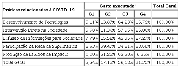 Em termos de ações totais, a proporção é de 22% para o grupo das universidades de menor orçamento e 78% para o das universidades de maior orçamento. Dessa forma, o que se observa pela Tabela 1, em padrões globais, é que existe uma relação positiva entre o recurso executado e a capacidade relativa a Práticas de Desenvolvimento de Tecnologias, de Intervenção Direta na Sociedade, de Difusão de Informações na Sociedade, de Participação na Rede de Suprimentos, e de Produção de Estudos de Impacto. Esta análise mostra que a menor proporcionalidade de práticas de G4 sobre G3 se dá pelo número de instituições, uma vez que G4 tem apenas três instituições, enquanto G3 tem nove. Contudo, tendo em vista que o volume de práticas de G4 é superior à G2 e G1, infere-se que há uma relação positiva entre o gasto executado e a capacidade de resposta a partir das práticas de combate à COVID-19. Ainda que o objetivo deste estudo não seja a precisão do percentual em si, uma vez que se trata de um recorte temporal, e evidentemente esses percentuais sofrerão alguma flutuação em novas coletas e análises, pontua-se que o padrão global, pela distribuição 80%-20%, denota, aqui, uma tendência à relação do gasto com a capacidade de resposta.