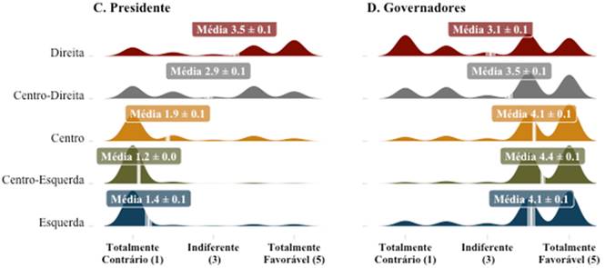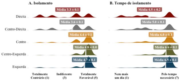 Os resultados indicam que a forma diametralmente oposta com que Bolsonaro - minimização da gravidade da doença e destaque aos impactos econômicos negativos que a política de isolamento potencialmente traz - e os governadores - priorização das políticas de isolamento social para diminuir a velocidade de contágio - reagiram à pandemia reconfigurou a polarização política anterior. Um contingente considerável de indivíduos que estariam dando suporte ao presidente migrou em direção ao polo oposto, quebrando o padrão bimodal, característico de cenários polarizados (Bello, 2019). Isso não significa, necessariamente, que as pessoas tenham mudado por completo as lentes através das quais enxergam o mundo ou sua ideologia/identidade política. Contudo, mostra que a pandemia pode ter sido capaz de reposicionar o eixo principal da polarização entre os que se identificam como de direita e centro-direita para além do antagonismo direto com a esquerda.