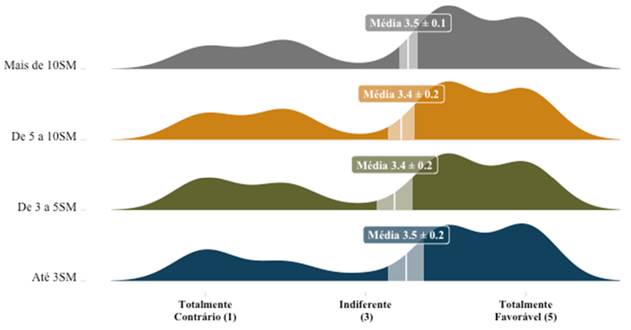 A fim de verificar tal argumento, testamos se o aparente antagonismo em relação ao isolamento social é de fato baseado nas diferenças de renda. A Figura 3 mostra que, ao contrário da expectativa de que as pessoas com diferentes faixas de renda deveriam exibir distintos padrões de apoio à política de isolamento social, a diferença entre as médias das distintas faixas de renda não é estatisticamente díspar. Ou seja, pelo menos até a semana em que os dados foram coletados, a sociedade não estava cindida pela renda. Os mais pobres e os mais ricos apoiam majoritariamente o isolamento social e se opõem à recomendação do presidente de voltar ao trabalho.