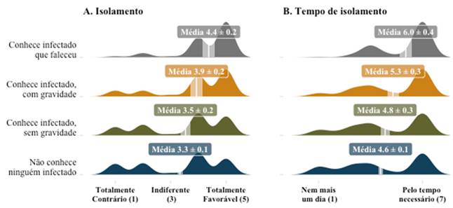 As respostas foram apresentadas em múltipla escolha com opção única e escala likert. O intervalo de confiança calculado para todas as médias foi de 95%. Para mensurar a variação da adesão ao isolamento entre os respondentes no que concerne ao prejuízo econômico esperado com a pandemia e à exposição de pessoas conhecidas em graus variados aos efeitos do vírus, utilizamos um conjunto de regressões lineares com erros-padrão robustos e regressões logísticas ordinais.