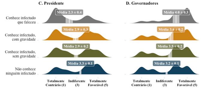É interessante observar o comportamento de eleitores de direita e centro-direita em relação ao isolamento social levando em consideração a proximidade a pessoas (amigos, parente etc.) que se contaminaram e desenvolveram a COVID-19 com graus variados de gravidade. A Figura 4 mostra claramente que, quanto maior a gravidade da doença em pessoas de seu convívio social, ou, em outros termos, quanto maior o espectro do “medo da morte”, mais alto é o apoio à política de isolamento social pelo tempo que for necessário.
