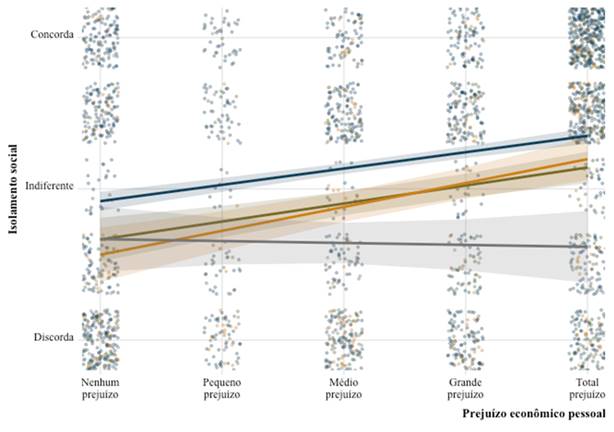 Embora, de fato, haja uma relação negativa entre prejuízo econômico esperado e apoio ao isolamento, os níveis de proximidade com a doença fazem diferença nessa relação. Para os que não conhecem pessoas contaminadas, quanto maior o prejuízo, menor o apoio ao isolamento. Porém, entre os que conhecem pessoas que vieram a falecer, essa variação não se verifica. Em outras palavras, a gravidade da contaminação que eventualmente venha a gerar óbito leva as pessoas a minimizar as potenciais perdas econômicas. O medo da morte parece não aproximar apenas polos ideologicamente opostos, mas também diferentes classes sociais e pessoas que estão vivenciando diferentes níveis de prejuízos econômicos em decorrência da política de isolamento social. Os resultados são igualmente consistentes para o apoio ao presidente no sentido oposto ao do apoio ao isolamento e aos governadores.