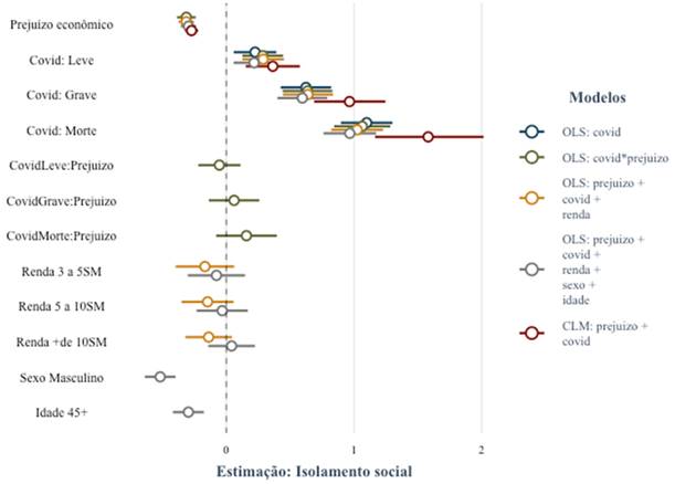 Como pode ser observado na Tabela 1 e na Figura 7, nossas expectativas foram confirmadas. Ou seja, o grau de proximidade de alguém contaminado pela COVID-19 aumenta as chances de apoio ao isolamento social. Fica claro que o grau de apoio ao isolamento social aumenta com a percepção de proximidade ao risco de morte. Em outras palavras, o medo da morte proporcionado pela pandemia é forte o suficiente para fragilizar os laços identitários/ideológicos entre esse grupo de eleitores e o presidente a ponto de esses eleitores contrariarem a orientação de seu líder e apoiar, de forma consistente, o isolamento social. Mantendo as outras variáveis constantes, é possível inferir que quem conhece alguém que morreu pela COVID-19 concorda com a política de isolamento social num nível 19,20% superior a quem não conhece pessoas contaminadas pelo vírus. Como havíamos mostrado, as diferentes faixas de renda não apresentam impacto estatístico significante no isolamento social. Entretanto, pessoas com expectativas de prejuízo econômico, mais velhas e do sexo masculino tendem a apoiar menos o isolamento social.