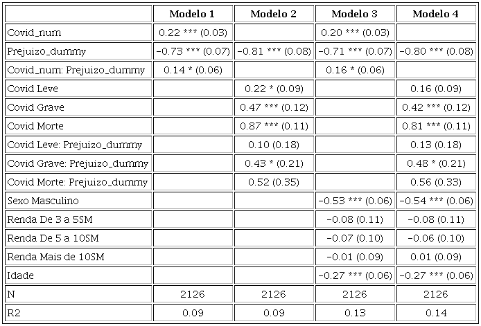 Operacionalizamos a variável covid de duas formas distintas: como variável quantitativa (covid num) e como variável qualitativa ordinal (covid), com 4 níveis. Já a variável prejuízo foi operacionalizada como dummy (prejuízo dummy), pelo fato de apenas a categoria de prejuízo total apresentar diferença de média de apoio ao isolamento em relação às demais. A Tabela 1 mostra os resultados das estimações com erros-padrão robustos.