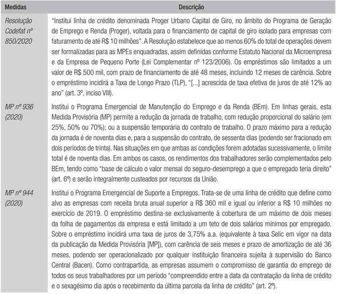 Desde a chegada da COVID-19 ao solo brasileiro, algumas medidas visando aliviar seus efeitos socioeconômicos sobre empresas e indivíduos foram adotadas pelo Governo Federal. Dentre o conjunto de ações destinadas à preservação das condições de operação e dos postos de trabalho nos pequenos negócios, três merecem destaque em virtude da expectativa de seus impactos: a Resolução nº 850 do Conselho Deliberativo do Fundo de Amparo ao Trabalhador (Codefat), de 18 de março de 2020 (Codefat, 2020); a Medida Provisória (MP) nº 936, de 1º de abril (2020) e a MP nº 944, de 03 de abril (2020). O Quadro 1 contém uma síntese de cada uma delas.