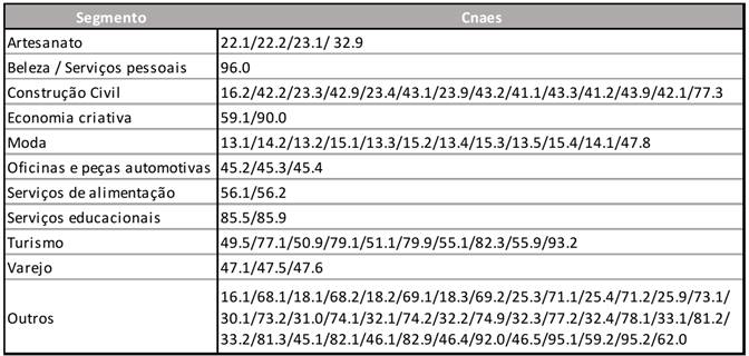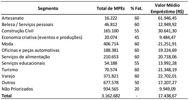 Por fim, tendo em vista que os demais segmentos também são indiretamente atingidos, uma vez que a atividade econômica do país se reduziu como um todo, consideramos necessário disponibilizar também o crédito, em um valor reduzido, para as demais MPEs que não se enquadrem nos segmentos considerados. No quadro 2, estas empresas estão agregadas no segmento “Não Priorizados”.