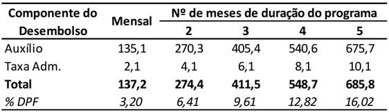 O financiamento presente dos desembolsos pode ser feito por intermédio da emissão de títulos públicos, posto que eles serão resgatados nas datas das amortizações dos empréstimos. Neste caso, conforme apresentado no Quadro3, para cada mês de duração do programa haveria um acréscimo de 3,20% no estoque da Dívida Pública Federal (DPF). Tais impactos se limitariam aos custos efetivos do programa, e na época do resgate dos títulos podem ser avaliadas as melhores formas de financiá-los.
