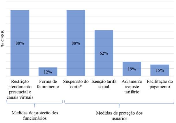 A Figura 2 apresenta o resultado do levantamento da adoção, por parte das CESBs, de cada uma das medidas apresentadas, que podem ter sido determinadas ou pelo próprio prestador, ou pelos governos estaduais ou reguladores, conforme descreve o texto. Para proteção dos funcionários, destaca-se, como medida adotada pelo maior número de companhias (88%), a restrição aos atendimentos presenciais, e para proteção dos usuários, a suspensão do corte do fornecimento por 88% das companhias estaduais - medida determinante na garantia da continuidade dos serviços a todos.