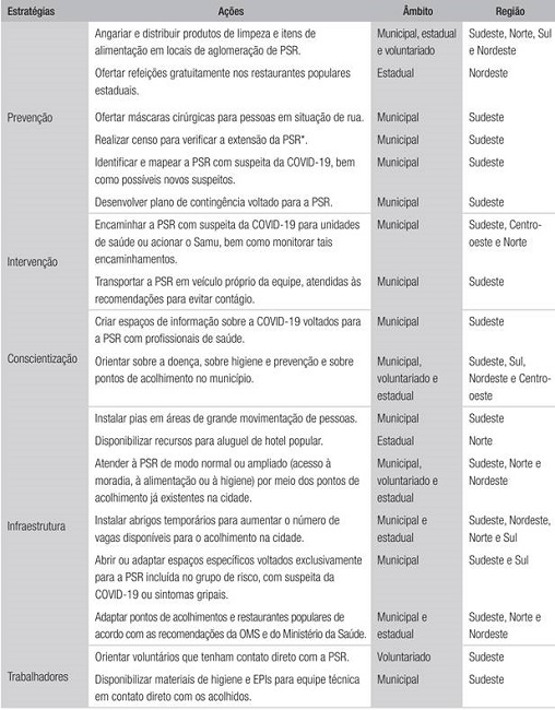 No levantamento das notícias que relacionam a PSR à COVID-19, categorizamos e analisamos ações de 15 estados, em mais de 30 municípios, em todas as regiões do país (Sudeste, Nordeste, Centro-oeste, Norte e Sul). Apresentamos essas ações e estratégias no Quadro 1. Identificamos, como categorias finais, cinco tipos de estratégias básicas que municípios e estados têm tomado: 1) de prevenção, 2) de intervenção por parte dos municípios, 3) de conscientização, 4) de infraestrutura e 5) voltadas aos profissionais que lidam com a PSR nos municípios. Também identificamos inciativas dos órgãos de controle estaduais e federais, como Defensoria Pública de Estado e da União, que categorizamos como ações do Judiciário para diferenciá-las das estratégias municipais.
