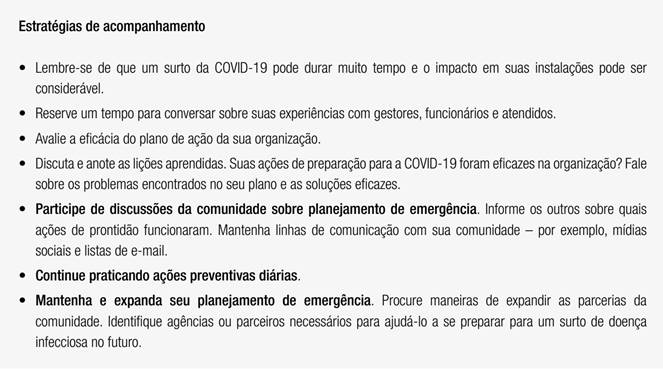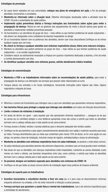 É interessante destacar ainda a diversidade de medidas de adaptação nos equipamentos de atendimento à PSR, desde as mais simples, como intensificação da higiene do ambiente e dos acolhidos, redução da capacidade de pessoas e afastamento dos beliches, até as mais complexas, como triagem de pessoas que apresentarem sintomas ou que compõem o grupo de risco, além de instalação de ambulatórios. Todos esses protocolos seguem as recomendações da Organização Mundial de Saúde (OMS) e do Ministério da Saúde.