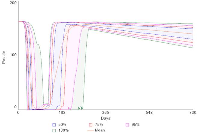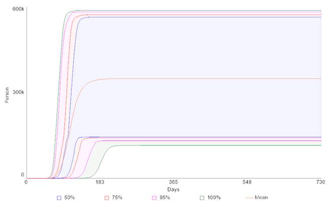 Model testing was conducted as suggested by Barlas (1996). As part of the testing procedures, sensitivity analysis (200 runs, Latin Hypercube) based on Fiddaman (2020) parameters reflected the degree of epidemiological uncertainty of the moment when the model was created. In Figure 2, we observe that the number of deaths could vary between 115,000 and 587,000 people in the Rio de Janeiro State, with a mean of 349,000 given uniform distribution for every uncertainty range of each uncertain variable in the model. The mean falls into a wide 50% confidence interval, revealing a high potential for the manifestation of extreme values given the uncertainty parameters treated in the two scenarios.