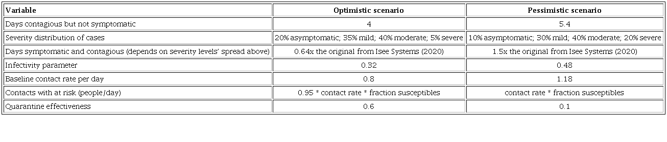 Given Fiddaman’s observations and the fact that our goal was not to predict the epidemic, we decided to assume an enormous epidemiological uncertainty in the model described as two extreme scenarios (extremely optimistic and extremely pessimistic). So, the impact of different strategies could be verified on the healthcare system across different epidemiological possibilities. As shown in Table 1 , quarantine effectiveness was considered as one of the uncertainty parameters. This methodological choice was made because social isolation was already a heavily politicized topic when this project started, subject to several information warfare maneuvers by elected officials and other actors. We had no hope of influencing the effectiveness of such measures and decided to treat them as contextual along with other variables in the epidemiologic scenarios, as opposed to testing it as a policy.