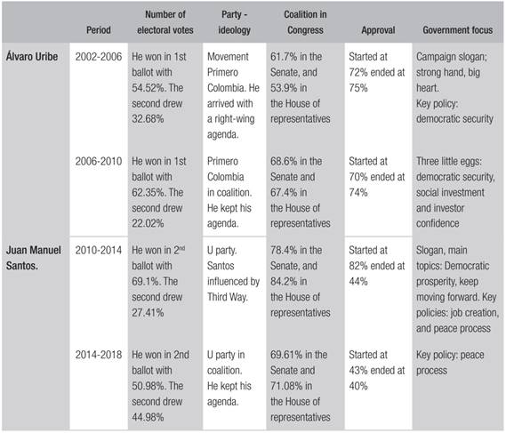 Former President Juan Manuel Santos also ruled two terms, from 2010 to 2018. Like Uribe, he had his political origins in the traditional Liberal Party but came into government with coalitions. Contrary to his predecessor he always won in the second ballot, in the first period with 69.1% of the votes and, in the second, with 50.98%. He came to power by the ‘U Party’, previously created to support Uribe, yet, more personally, Santos has acknowledged having profound influences from the Third Way (Santos & Blair, 1999). During his first term he had a great coalition in the legislative power with 78.4% in the Senate and 84.2% in the House of Representatives (Duque, 2018), which he largely managed to retain for his second government. In his first term he started with 82% approval and ended with 44%, while in the second, and despite the peace agreement, which was his main priority, he ended with 40%.