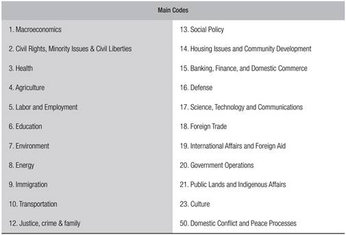 The CAP is based on a system of codes (See Box 2) applied to various indicators of public action by country and according to its content, seeking to ensure comparability and backward compatibility. Traditionally, the process of preparing the codebook by country and the codification process is done by teams working on research projects financed with public resources. In the Colombian case both processes have been at the head of a single person, a doctoral student, who has been creating the codebook in parallel with the coding.