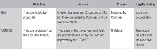 For this paper, we extracted from the databases of bills and CONPES those corresponding to the Uribe and Santos governments, 829 and 839 respectively. In the following subtitle we delve into and compare these two instruments. We put special emphasis on the CONPES, which are a distinctive type of document of the Colombian case, without reference within the existing CAP databases. Finally, we justify the choice of the period chosen for the analysis.